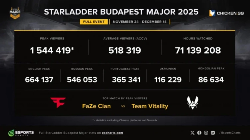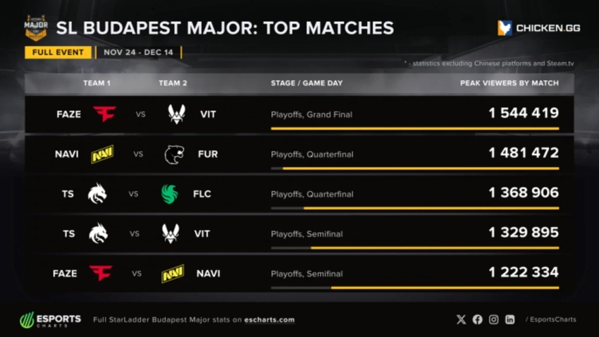 Наибольший ажиотаж вызвал решающий поединок за титул между Team Vitality и FaZe Clan — именно он стал самым популярным матчем ивента. Также в тройку лидеров по просмотрам вошли четвертьфинальные встречи с участием медийных команд: NAVI, FURIA, Team Spirit и Falcons.