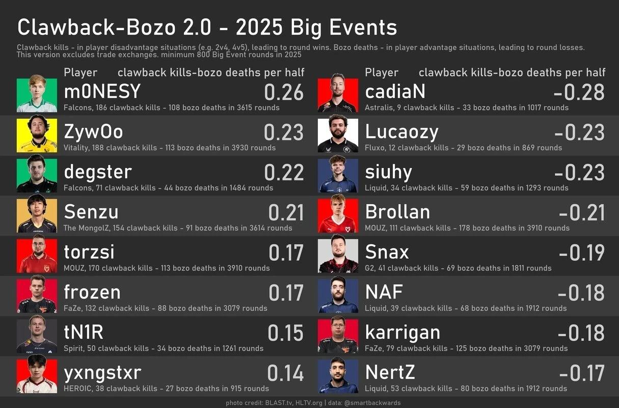 Источник: HLTVНезависимый аналитик btrams по Counter-Strike 2 опубликовал интересное исследование, в котором оценил эффективность профессиональных игроков в зависимости от численности команд на карте. Он ввел два специальных показателя: Clawback (убийства в меньшинстве, приведшие к победе) и Bozo (смерти в большинстве, приведшие к поражению).