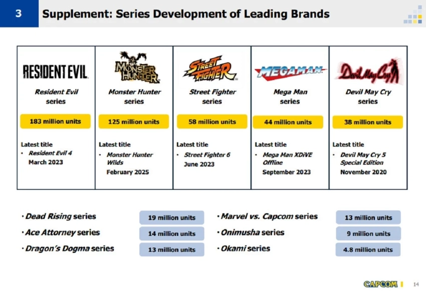 Среди продаж серий перестановок нет, зато некоторые из них успели прибавить ещё несколько миллионов копий в сравнении с весной 2025 года. Например, за девять месяцев различные части Resident Evil купили 13 миллионов раз. В случае с Monster Hunter и Devil May Cry рост составил 5 миллионов, а в мир Street Fighter прибыло ещё два миллиона бойцов.