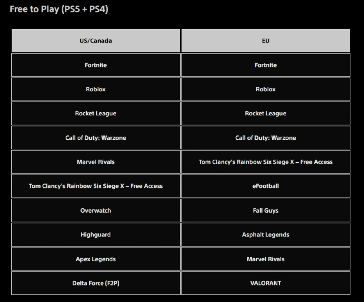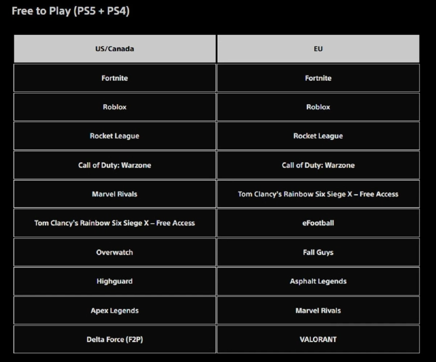 Среди условно-бесплатных игр предпочтения игроков из США с Канадой и Европы оказались схожими. Первые четыре места в обоих сегментах заняли Fortnite, Roblox, Rocket League и Call of Duty: Warzone. При этом в Северной Америке ровно посередине в топ-10 расположилась Marvel Rivals — в Европе геройский шутер занял девятую строчку по загрузкам.